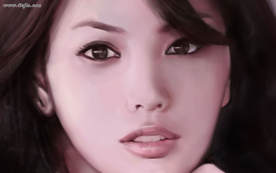 9:细化局部及高光。在全画的光影、体积感和色彩都塑造差不多时,就可以进入细节的刻画,在这个步骤里,细化了五官的结构,校对了一下眼神,并且将高光刻画了出来。需要提的是,这里在鼻子和嘴唇的高光刻画上花了相当的功夫,特别是嘴唇上沿的高光给人物增添了不少神采。